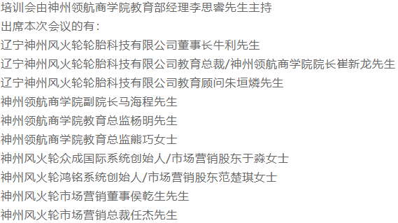 本次代理商培訓(xùn)會(huì)的明星導(dǎo)師10余位,將陪伴大家共同度過這三天兩夜。本次培訓(xùn)會(huì)旨在為新晉代理商伙伴闡述神州風(fēng)火輪企業(yè)文化、樹立整體市場(chǎng)觀念、規(guī)范營銷制度、拓展?fàn)I銷思路。