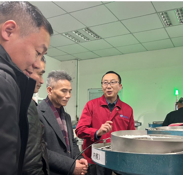 (原秀科技執(zhí)行副總鄧瑞華在生產(chǎn)車間向校領(lǐng)導(dǎo)介紹公司產(chǎn)品和智能化需求)