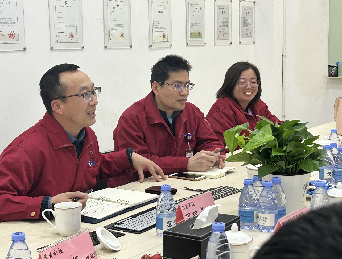 本次活動伊始,校企雙方共同到原秀科技生產(chǎn)車間實地考察,原秀科技執(zhí)行副總鄧瑞華向?qū)W院領(lǐng)導(dǎo)著重介紹了公司產(chǎn)品、企業(yè)文化、人才需求,而后一同座談交流,柳書記向公司介紹了學(xué)校辦學(xué)歷史、辦學(xué)特色、人才培養(yǎng)模式、學(xué)科專業(yè)建設(shè)等整體情況,其中,重點對2024屆畢業(yè)生情況、就業(yè)方向、就業(yè)形勢作了詳細介紹。